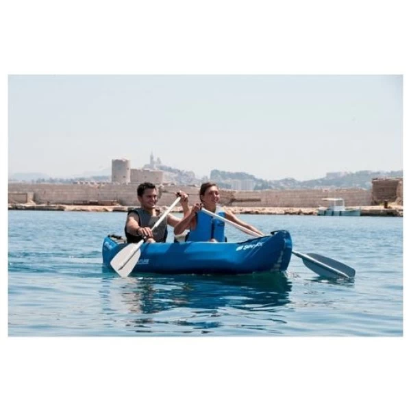 The canoe is suitable for two people and has a capacity of about 165 kilograms. The inflatable seats are easily adjustable and have a high backrest. This ensures a comfortable seat. The boat is equipped with a fin at the bottom. This increases the manoeuvrability of the canoe.